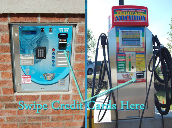 All major Credit Cards are accepted. We have outside Vacuum for you to use in order to clean the inside of your vehicle. Most Vacuum Cleaners will also accept Credit Cards. Our Vacuum machines also have Carpet Shampoo and Fragrance.